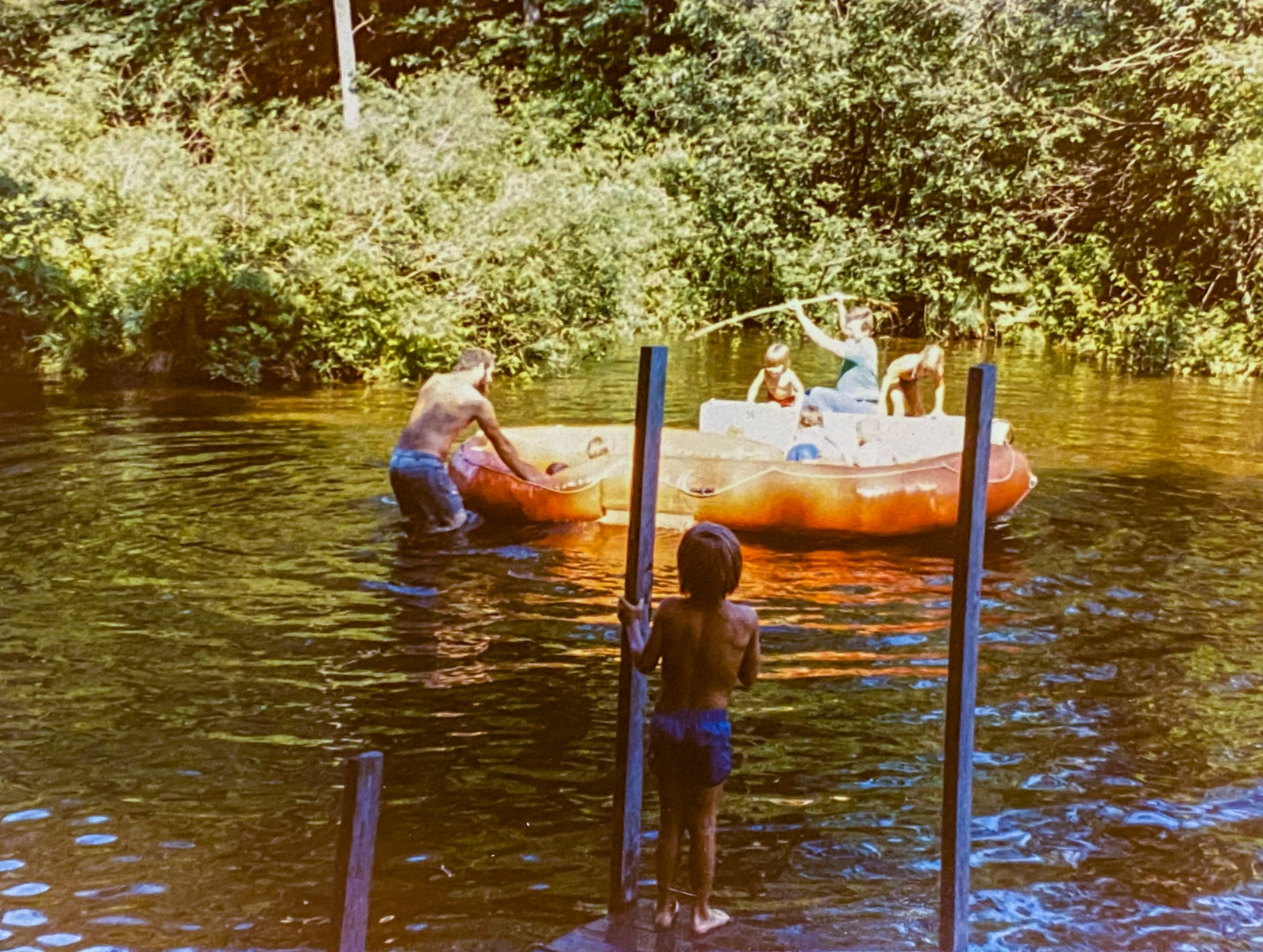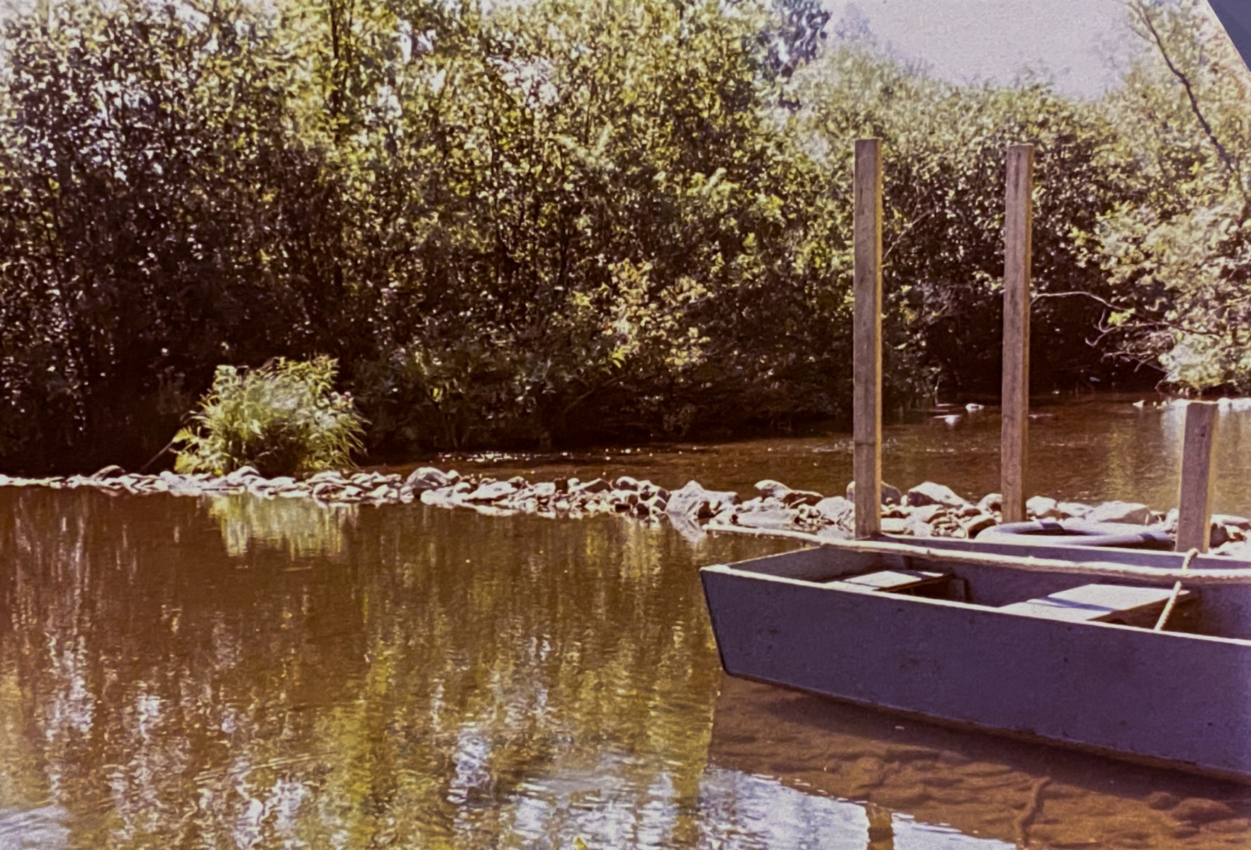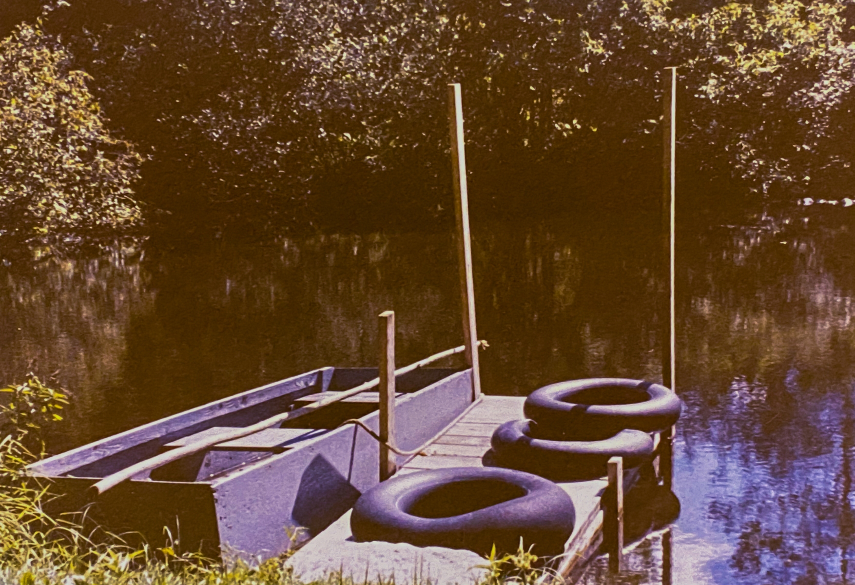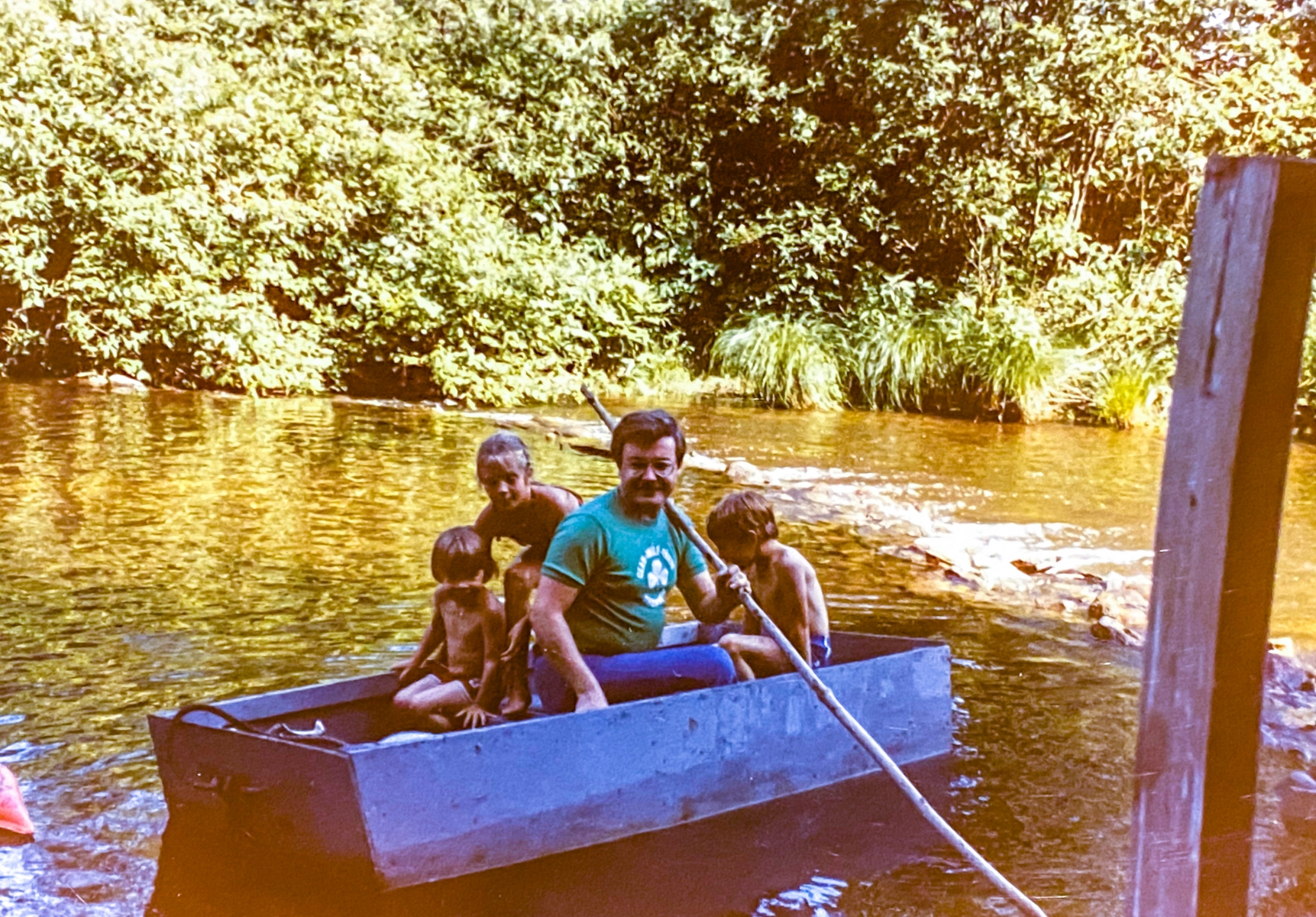 One year when we were young, dad built a dock and we kept the end-poles long to tie up the boat and throw the inner tubes over. Then he fashioned a flat-bottomed boat out of plywood with two bench seats and a long pole to move it around. We painted it a glossy grey and sealed it up real well. Being wood, it still leaked and we were always bailing that thing out with coffee cans. We loved it though and rowed all over out area between our dam and the neighbor’s dam. We lost it a few times during the spring floods, but dad always managed to rescue it downstream. One year it was gone for good, but we had lots of good memories on that boat.