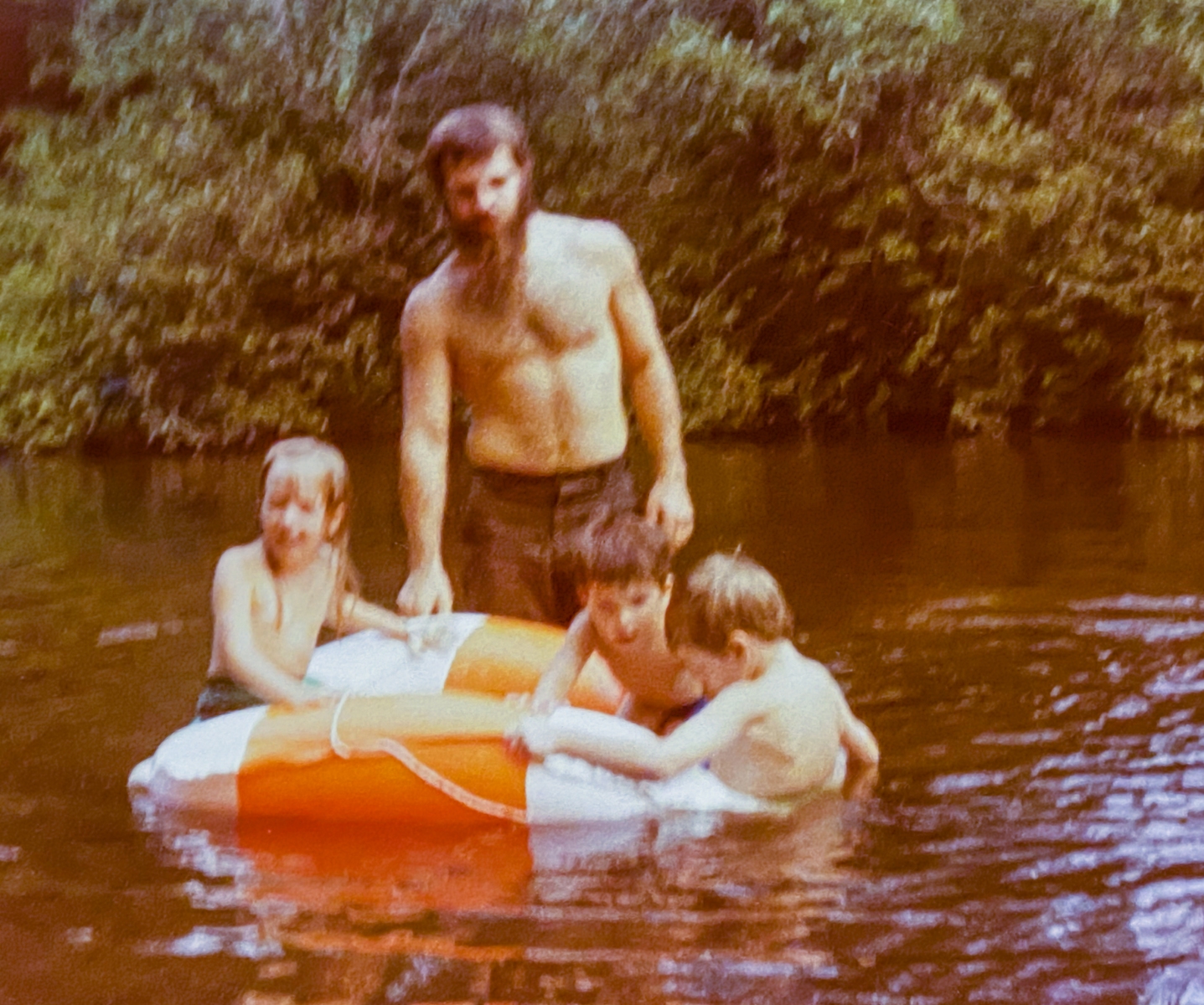 Our house was built on a hill that sloped down to the crick. During the spring, the melting snow and rains would cause the crick to rise rapidly. It would be like a raging river. Never came near the house, but it was still scary to see. One spring, the water was rushing pretty good, and Dad got the idea to take a tube down the crick and have Mom pick him up at a nearby bridge. We wanted to go with him but he said no. He jumped in the tube and off he went. When he came back, he told us that it was good that we didn’t come because it was all he could do to hold on. He said there were trees down over the water and he almost got his head taken off and he barely was able to grab the bridge railing in time! I’m sure it was exhilarating but I don’t think mom was too much in favor of these shenanigans. There was a big tree down by the dam, and Dad tied a rope way up there for us to swing out over the water. The crick was fairly shallow during the summer. Enough to get wet and swim around, but only a couple feet in most places and even shallower in others. We had one area that we cleverly called “the deep part.” Well, one day, after begging him forever, Dad brought the backhoe down and dug out the “deep part” to about 7’ down. It was epic because then we could drop off the rope into the water. Of course Matt and I were always finding excuses to go in the water. We would ask Mom if we could go swimming, and if it wasn’t quite hot enough, she would say, you can only go wading. Well, you know how that went. Or we would build a raft out of a pallet and inner tubes, you know, so we “wouldn’t get wet” but Matt always seemed to fall in. And then I followed suit. One year Matt spent most of the summer trying to build a dugout canoe out of a hollow log. I don’t remember if he ever got that thing to float.