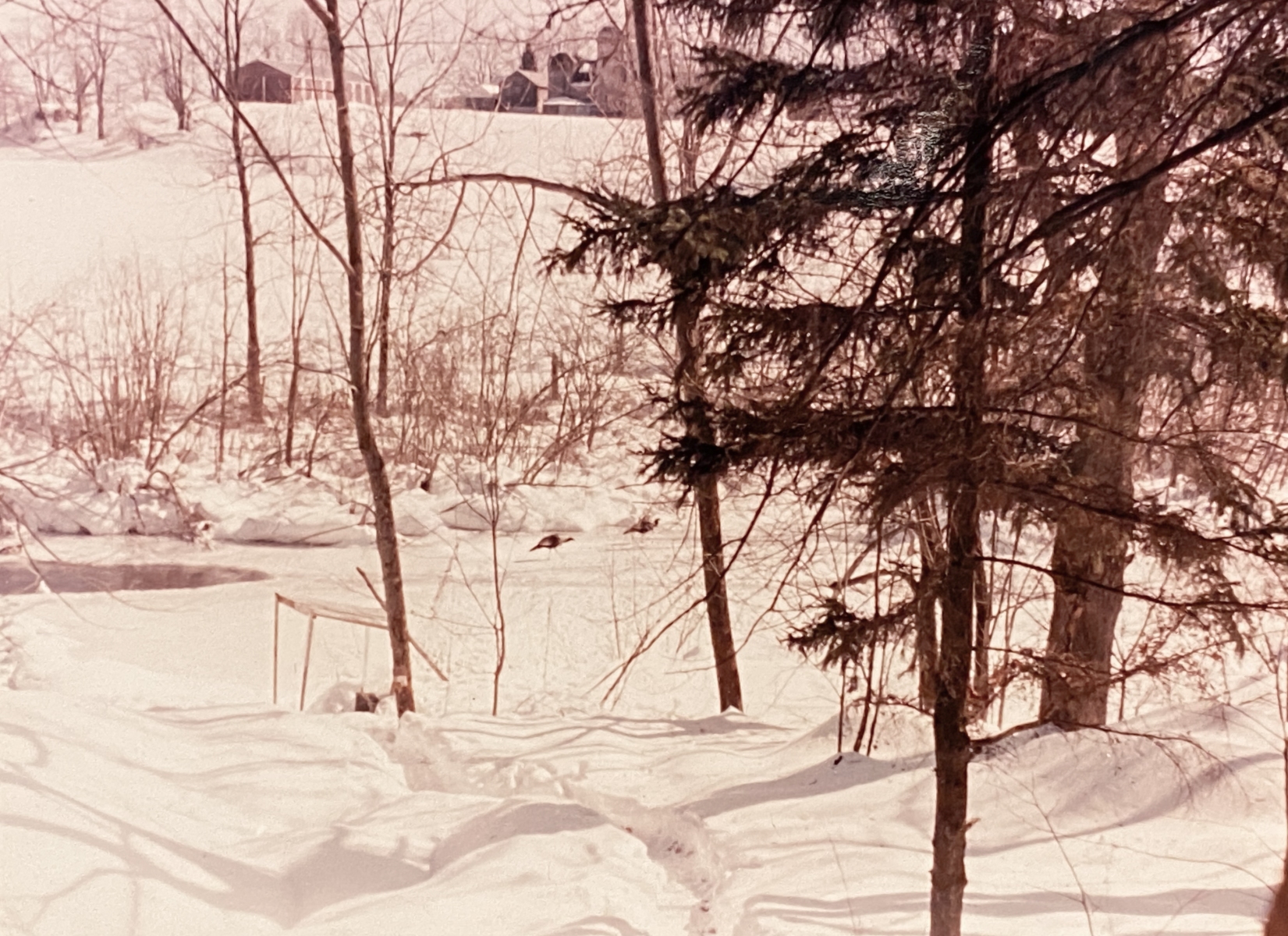 In the winter, the crick would freeze, which was good because when we went sleigh riding (sledding) it was much more fun to be able to “make it to the crick” on the sleds. We also would go ice skating after clearing off a space with the snow shovels. Well one year it was a cold year, so Dad decided to put the ice to the test. He got his bulldozer out there and plowed off a fantastic ice rink for us. He said the ice was like a foot thick. We had ducks. Three of them, actually. Bossy, Pegleg, and Lophead, And when it would get super cold, sometimes they were not able to keep a hole open in the water. Dad would go down to the ice and chop a hole with his axe for the ducks. I remember one day it was 24 degrees below zero, and sure enough, those ducks were swimming around in that hole. Sadly, we did lose one duck when he went down under the water, got caught under the ice and could not resurface.