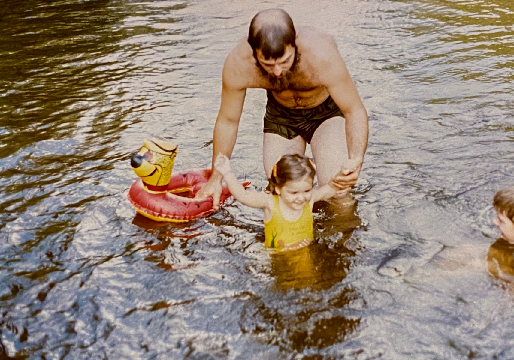 Our house was built on a hill that sloped down to the crick. During the spring, the melting snow and rains would cause the crick to rise rapidly. It would be like a raging river. Never came near the house, but it was still scary to see. One spring, the water was rushing pretty good, and Dad got the idea to take a tube down the crick and have Mom pick him up at a nearby bridge. We wanted to go with him but he said no. He jumped in the tube and off he went. When he came back, he told us that it was good that we didn’t come because it was all he could do to hold on. He said there were trees down over the water and he almost got his head taken off and he barely was able to grab the bridge railing in time! I’m sure it was exhilarating but I don’t think mom was too much in favor of these shenanigans. There was a big tree down by the dam, and Dad tied a rope way up there for us to swing out over the water. The crick was fairly shallow during the summer. Enough to get wet and swim around, but only a couple feet in most places and even shallower in others. We had one area that we cleverly called “the deep part.” Well, one day, after begging him forever, Dad brought the backhoe down and dug out the “deep part” to about 7’ down. It was epic because then we could drop off the rope into the water. Of course Matt and I were always finding excuses to go in the water. We would ask Mom if we could go swimming, and if it wasn’t quite hot enough, she would say, you can only go wading. Well, you know how that went. Or we would build a raft out of a pallet and inner tubes, you know, so we “wouldn’t get wet” but Matt always seemed to fall in. And then I followed suit. One year Matt spent most of the summer trying to build a dugout canoe out of a hollow log. I don’t remember if he ever got that thing to float.