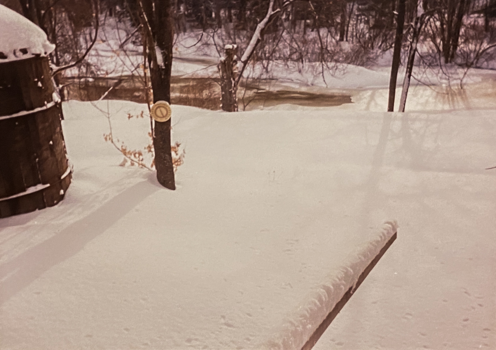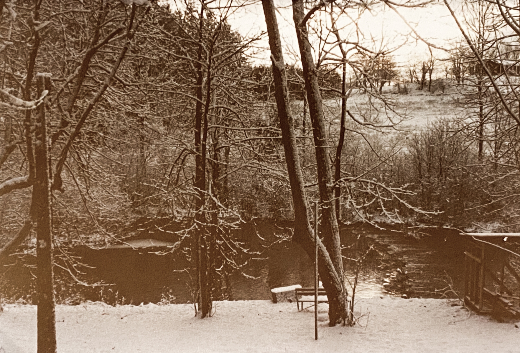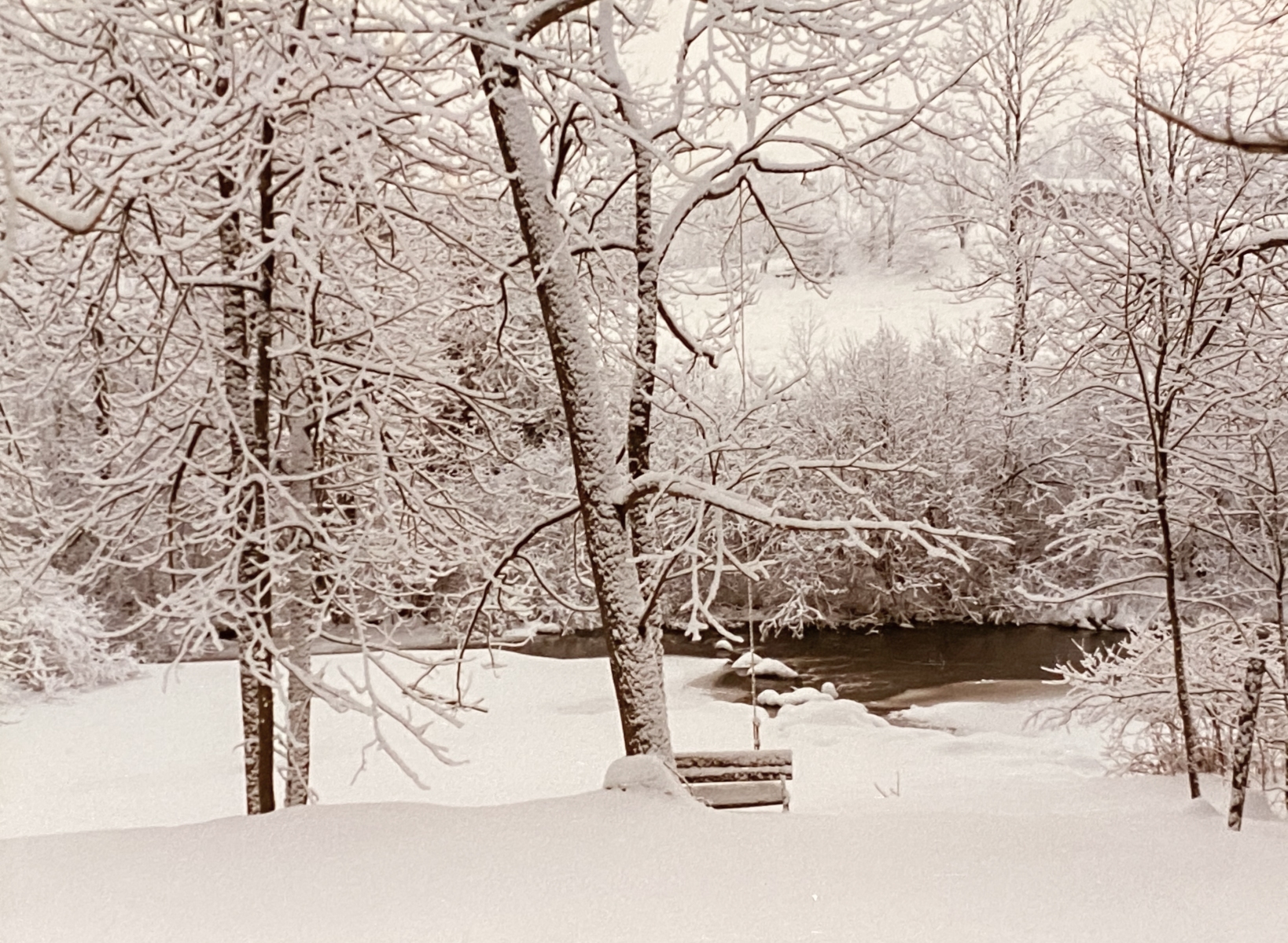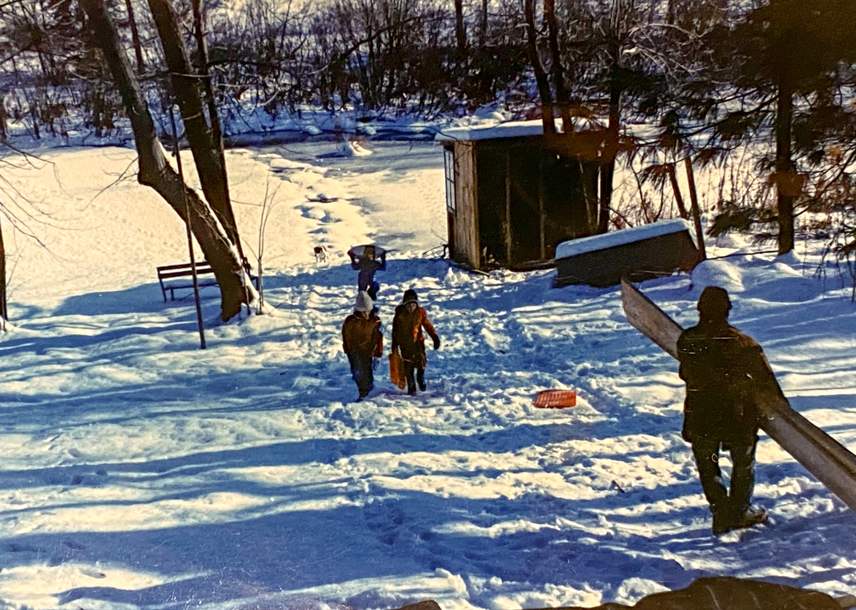 In the winter, the crick would freeze, which was good because when we went sleigh riding (sledding) it was much more fun to be able to “make it to the crick” on the sleds. We also would go ice skating after clearing off a space with the snow shovels. Well one year it was a cold year, so Dad decided to put the ice to the test. He got his bulldozer out there and plowed off a fantastic ice rink for us. He said the ice was like a foot thick. We had ducks. Three of them, actually. Bossy, Pegleg, and Lophead, And when it would get super cold, sometimes they were not able to keep a hole open in the water. Dad would go down to the ice and chop a hole with his axe for the ducks. I remember one day it was 24 degrees below zero, and sure enough, those ducks were swimming around in that hole. Sadly, we did lose one duck when he went down under the water, got caught under the ice and could not resurface.