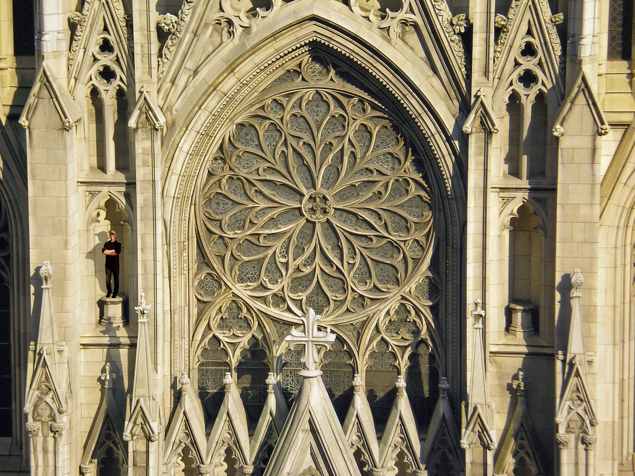 Wow. Such a crazy adventure today. Usually I would not go to extremes like this, but my Uncle Tom was begging for something interesting this year, so I capitulated and went all out. Traveling to NY early this morning via a Gulfstream G6 (cuz I am rich like that), I wound up at the famous St. Patricks Cathedral. I bribed a security guard with a couple of Benjamins and he let me climb up to get a close up view of the spectacular Rose Window. (I think he also enjoyed my sporting new bright green UA cap.) While I was clambering around, I noticed there were two empty spots perfect for standing. Being conservative, I chose the one on the right side. My buddy was with me and got this shot from his drone. All in all, a very successful day and wonderful adventure. Happy St. Patrick’s Day all! Sláinte!